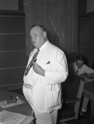 City council member I. N. McCrary was elected mayor of Fort Worth, Texas. He is wearing a suit and holding a cigar in his left hand. He is standing behind a table. On the table are several sheets of paper and a gavel. In the background is an unidentified man sitting at a desk.