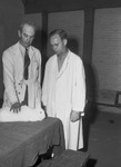 Marvin O. F. Davis of Denton, Texas is the judge of a Rabbit Show. He is shown with the winner, a New Zealand white doe. The doe is owned by Arthur Fraley. Mr. Davis is wearing a suit with a lab coat. The rabbit is laying on a table. There is another man next to Mr. Davis who is also wearing a lab coat.