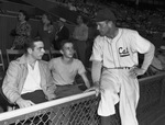 Ray Haworth, manager of the Fort Worth Cats baseball team with his sons, Ray Junior, left and John. The Fort Worth Cats are in the Texas League and the AA affiliate of the Brooklyn Dodgers. Mr. Haworth is wearing a Fort Worth Cats uniform. He has a long sleeve shirt under his jersey and is wearing high socks. He is sitting on the edge of the fence as he talks to his sons in the first row of the stands. Ray Jr. is wearing a collared shirt, trousers, and a coat. John is dressed in a t-shirt and trousers. There is a large crowd in the stands and several people making their way to their seats.