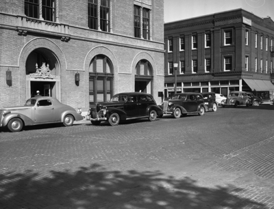 Image shows a Shot of Throckmorton Street in Fort Worth, Texas, showing the Telephone Company building in the background. Three cars are parked behind each other in front of the building. Further down the street is another large building for the Texas National Guard. A few people are walking on the street. Published in the Fort Worth Star-Telegram evening edition July 18, 1940.