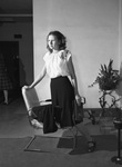 Joyce Chambers is Miss Tarrant County of the 4-H Style Show contest. She hopes to win the state contest in August to entitle her a free trip to Chicago to attend the December 4-H Congress. Joyce is wearing a blouse with a flower pattern on the shoulder, a pearl necklace, and a navy skirt. She is standing with one knee on a chair. She is holding her purse and her suit blazer is draped across the chair.