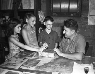 Donating to the Forest Park Zoo's baby elephant fund are left to right, Anita Marie Griffith, Jean Vance and Billy Van Cox. Holding the contribution box is Zookeeper Hamilton Hittson. Anita Marie and Jean are residents of Fort Worth, Texas. Both girls are wearing summer dresses. Billy is visiting the zoo from Paris, Texas. He is wearing a short-sleeve, button-up shirt. Mr. Hittson is sitting at the table, wearing a short-sleeve, button-up shirt.