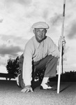 Smiley Rowland, host pro for the Glen Garden Invitation held at the Glen Garden Country Club, tested the newly conditioned greens. Glen Garden Country Club is where Ben Hogan and Byron Nelson met and learned the game of golf as caddies in the 1920s. Mr. Rowland is wearing a driving cap, button-up shirt, trousers, and golf shoes. He is kneeling on the ground holding the flag.