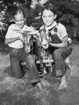 Donna Jean Jones, ten, left, and her brother Billy, fifteen, shown with Silver and Betty, two of their four goats. The children are rarely idle and always having something to do. They made twelve dollars by hauling kindling in a wagon pulled by their goats. Donna Jean is wearing a button-up shirt and blue jeans. Billy is wearing jean overalls that are cuffed at the bottom. Behind the children are several trees and a house.