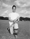 Slugger Yale Lary, is a fifteen year-old shortstop for North Side High School. He is one of the leading hitters in American Legion baseball. Yale is kneeling in the field. He is wearing a baseball cap, a t-shirt, baseball pants with high striped socks, and cleats. He is holding a baseball bat by the barrel. Throughout his high school career, Yale lettered in football, baseball, track, and basketball. Yale went on to play baseball and football at Texas A&M University. He was drafted by the Detroit Lions in 1952. He played professional football for eleven years and was inducted into the Pro Football Hall of Fame in 1979.