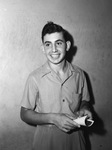 Milton Shifflett, son of Mrs. J. E. Fuchs, is the local representative to attend the national Red Cross convention. Milton is a member of the Junior Red Cross Student Council. He is a senior art student at Amon Carter Riverside High School. Two of his paintings were exhibited in the National Art Contest in Philadelphia, Pennsylvania. Milton is wearing a checkered short sleeve shirt and trousers. He is holding a rolled-up piece of paper.