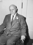 Walter Russell, a sculptor and philosopher spoke at Fort Worth, Texas on June, 18, 1946. Mr. Russell visited the Botanic Gardens and remarked of the beautiful environment. He spoke on "Intimate Sketches of Famous People" and pointed out the philosophies that made people like Theodore Roosevelt, Franklin Roosevelt, Thomas Edison, and other great men. He is giving a series of lectures in key cities across the U.S. on "The New Age Philosophy." Mr. Russell is sitting in an armchair. He is wearing a suit with a flower pinned to the lapel.