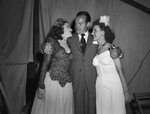While on tour in Fort Worth, Texas on June 18, 1946, Bob Hope met with local girls Virginia Dofflemyer, left, and Sally Lang. The women were winners of WBAP's singing contest. They were getting chummy with Mr. Hope before his variety show at Farrington Field. Mr. Hope planned to ad-lib and wise crack his way through the two-hour benefit in front of 9,000 fans. The women are wearing fancy dresses and feathers in their hair. Mr. Hope is wearing a suit with a pocket square.
