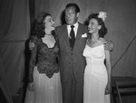 While on tour in Fort Worth, Texas on June 18, 1946, Bob Hope met with local girls Virginia Dofflemyer, left, and Sally Lang. The women were winners of WBAP's singing contest. They were getting chummy with Mr. Hope before his variety show at Farrington Field. Mr. Hope planned to ad-lib and wise crack his way through the two-hour benefit in front of 9,000 fans. The women are wearing fancy dresses and feathers in their hair. Mr. Hope is wearing a suit with a pocket square.