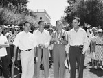 While on tour in Fort Worth, Texas on June 17, 1946, Bob Hope stopped by the Colonial Country Club for a round of golf. Mr. Hope was in town to perform his variety show at Farrington Field the next day. The golfers left to right are: Jack Malloy, E. W. Landreth Junior, Bob Hope and W. A. Moncrief. Mr. Malloy is wearing a short-sleeve shirt, trousers, and a golf glove. Mr. Landreth is wearing a button-up shirt and trousers. He is leaning on a golf club. Mr. Hope is wearing a striped short sleeve shirt and trousers. He has a golf club tucked under his arm. Mr. Moncrief is wearing a button-up shirt, trousers, and a golf club. He is holding a golf club and his hat. A crowd of people are following the golfers as they make their way to the tee box. The club house is in the distance.