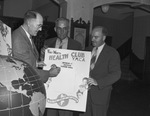 YMCA campaign for World Service Funds. Left to right: H. B. Copeland, YMCA director, solicitor Fred B. Porter, and Paul Hayward, general secretary of the Fort Worth, Texas "Y." Mr. Copeland is wearing a pinstripe suit. He is signing his name on the poster board. Mr. Porter is wearing a suit. Mr. Hayward is dressed in a suit with an argyle patterned necktie. There is a globe in front of Mr. Copeland.