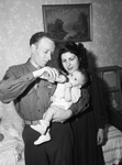 Sergeant George E. Wells and the former Marie Antoinette Donadey of Marseilles, France with their son Richard. Mrs. Wells and six month old Richard arrived from France after he was critically ill aboard the Zebulon Vance. Sergeant Well received emergency leave from Fort Sam Houston to meet his family. After spending some time in the hospital, Richard was given a clean bill of health. Sergeant Wells is holding the baby and feeding him a bottle. Mrs. Wells watched with approval. Sergeant Wells is dressed in his military uniform. Mrs. Wells is wearing a dark-colored dress. There is a painting on the wall behind them.