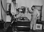 Eagle Mountain Marine Base Polio Hospital. The Navy turned over ownership of the hospital, equipment, and supplies to Fort Worth and Tarrant County. The hospital will be used for patients recovering from polio. Master Technical Sergeant William Primm of Dallas is inspecting a X-Ray machine, part of the modern equipment included in the Navy's gift. Master Technical Sergeant Primm is dressed in his military uniform.