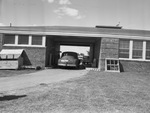 Eagle Mountain Marine Base has been used as a base hospital for patients recovering from polio. The Navy is turning over the hospital along with the equipment and supplies to Tarrant County. The building will used as a hospital for Fort Worth and Tarrant County patients recovering from polio. The picture shows the loading zone section of the hospital. There is an automobile pulled inside. There is a dolly on the curb and a delivery truck in the distance.