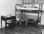 Private First Cadet William G. Bartels of Cincinnati, Ohio is a patient at Eagle Mountain Marine Base Polio Hospital. Private Bartels is sitting on the bottom bed of a bunk bed. He is wearing a button-up shirt and trousers. His hat is sitting on his bed. There is a desk next to the bed with a radio, ash tray, and a book.