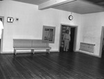 Major E. E. Pegan in the hospital foyer of the Eagle Mountain Marine Base. Major Pegan is standing in the doorway wearing his military uniform. There is a clock above the doorway that reads ten 'til four. There is a fire alarm and a glass case with a fire hose against the back wall. There is also a bench and radiator in the foyer.