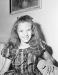 Carolyn Craig, daughter of Mr. and Mrs. A Andrew Craig, produced and directed a carnival in the backyard of her home. Along with her sister Katheryn and two neighborhood children, Dennis O'Connor and Betsy Webster, they put on a show which included acrobatic acts, singing, dancing, and tricks. About twenty people attended the show and Carolyn turned the proceeds over to famine relief fund. Carolyn is sitting on a striped couch. She is wearing a plaid dress with a matching bow in her hair. There is a painting hanging on the wall above her head.