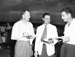 Advertising Club Barbecue left to right: Jim Edwards, Jack Hall, and Ray Lee. Mr. Edwards, first vice president, is chowing down on a plate of barbecue. He is wearing a button-up shirt and trousers. Mr. Hall, director, is wearing a sports coat, neck tie, and trousers. He is balancing a plate of barbecue and a cigarette. Mr. Lee is President of the Advertising Club of Fort Worth. He is wearing a button-up shirt and trousers. The club's annual picnic was held at Meadowbrook Country Club.