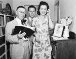 Trans-Atlantic Wedding - Despite the 5,500 mile separation, Emma Elizabeth Weatherly, married Lieutenant Dwight L. Baker, in a telephone wedding from Fort Worth, Texas to Frankfurt, Germany. The ceremony was performed by Lieutenant Baker's father, Reverend W. D. Baker at their home. Bill Baker, the bridegroom's brother, stood by to read the benediction. Miss Weatherly is standing next to a bookcase holding the telephone receiver. She is wearing a floral dress. There is a picture of Lieutenant Baker on the bookcase. Reverend Baker is wearing a light-colored suit. He is holding a telephone in one hand as he reads from the Bible. Bill Baker is standing behind them, dressed in a suit.