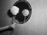 A freak dahlia was grown in the Fort Worth Botanic Garden. The dahlia consists of a pale pink and a deep pink bloom front to back on a joint double stem. A woman with painted finger nails is holding the flower in a mirror to show both sides.
