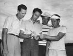 Glen Garden Golf group left to right: Bill Shelton, Son Taylor, Gene Magruder, and Will Morris. The quartet from Rockwood, Texas was among the contenders for the Glen Garden Invitation title. Mr. Shelton is wearing a short-sleeve shirt and trousers. He has an arm on Mr. Taylor's shoulder and a cigarette in his hand. Mr. Taylor is wearing a button-up shirt with the sleeves rolled up and jeans. He is tallying the scorecard. Mr. Magruder is wearing a bucket hat, a striped shirt, and trousers. Mr. Morris is dressed in a visor, t-shirt, and trousers.