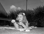 Carolyn Carlock, daughter of Mr. and Mrs. R. L. Carlock, shown taking aim with a rifle. She is outdoors, lying on her stomach on a blanket in the grass. She is wearing a striped blouse and has ribbons in her hair.