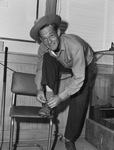 Glen Garden Invitation - Iverson Martin, tying shoe strings in club room after carding a thirty-four on both the front and back nine for a round score of sixty-eight and medal honors. Mr. Martin has his right foot on a chair as he ties his golf shoes. He is dressed in a hat, a button-up shirt, and trousers. There is a telephone on top of the display case behind Mr. Martin.