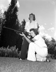 Jean Bristol (kneeling), daughter of Mr. and Mrs. R. E. Bristol, is shown ready to fire a rifle. She was a sharpshooter in the National Rifle Association (NRA) Junior Division at Camp Waldemar, near Kerrville, Texas, the past summer. Standing at the left is Glenn Hill, daughter of Mr. and Mrs. Houston Hill, who also won recognition for marksmanship at Camp Waldemar. Both women are wearing short-sleeve blouses and trousers.