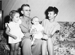 After his arrival in Fort Worth, Texas, First Lieutenant W. D. Rhoten (second from left) spent the day getting acquainted with his son, William Donald Rhoten Junior (second from right), who was born while he was in Alaska, and reacquainted with his daughter, Donna Rhoten (left), 3. They are shown with Mrs. Rhoten (right) at their home at 300 North West 20th. Lieutenant and Mrs. Rhoten are sitting on a couch and Lieutenant Rhoten is holding his son on his lap. Donna is standing beside her father and is wearing a dress. Lieutenant Rhoten is wearing his military uniform and eyeglasses and Mrs. Rhoten is wearing a dress.
