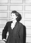 Betty Pecor, singing contestant, standing, wearing a blouse, coat and earrings.