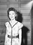 Sally Lang, singing contestant, standing, smiling, wearing a dress cinched at the waist with a belt.