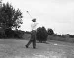 Bill Skeeters shooting at Glen Garden golf match. He is wearing a shirt, trousers and a hat and is swinging a golf club. In the background are several trees and shrubs.