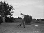Golfers. Earl Stewart, Dallas, Texas, in action. He is in the finish phase of his swing. Two unidentified men look on, behind him, in the distance. Published in Fort Worth Star-Telegram.