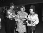 Moslah Temple Shriners getting ready to leave for Abilene, Texas, were, left to right, Jack Shytles, Mrs. Art Ford and Doctor C. L. Sharp. Mrs. Ford is wearing a dress and hat and is holding a purse and pair of gloves. Shriners Shytles and Sharp are wearing shirts that read "Moslah," trousers and fezzes.