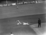 The Shreveport Sports arrived in Fort Worth, Texas, for a series against the Fort Worth Cats. The Cats' first baseman Lou Ruchser slid feet first into second base ahead of the throw from shortstop to Shreveport second baseman Al Mazur. The umpire is standing on the grass preparing to call the runner safe.