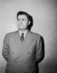 Rabbi Isadore Garsek, 32, former rabbi at Lubbock, Texas and instructor at Texas Technological College, who was separated from the Army Chaplain's Corps, has accepted a call to serve Congregation Ahavat Shalom effective August 1. He is standing in front of a bare wall, wearing a suit and eyeglasses.