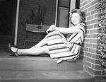 Miss Dorothy Ann Lewis, 19, daughter of Mr. and Mrs. Leon Lewis, will model cotton fashions at a Lions' Cotton States Jubilee fashion show at Philadelphia, Pennsylvania July 16. She will be the only Texas model. She is shown wearing a striped dress, sitting on a set of steps outside a house.