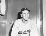 Fred Collins is a first baseman with the Beaumont Exporters, the Minor League affiliate to the New York Yankees. The left-handed Collins is leading the Texas League with a.362 average. Collins is sitting in front of a door, wearing Beaumont's road uniform.