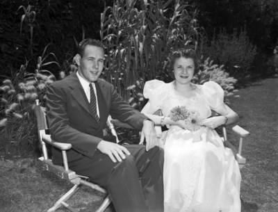 Mr. and Mrs. J. G. Page Junior, just married, are sitting in chairs outdoors. Mr. Page is wearing a suit and his bride is wearing a wedding dress and holding a bouquet of flowers. Behind them are an array of bushes and other plants.