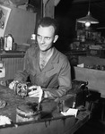 Disabled vet at work. More than 150 disabled war veterans are receiving on-the-job training with Fort Worth business concerns. Ward H. Nowlin, Arlington, Texas, tinkers with a magneto at Generator Service Company. In this picture, Mr. Nowlin, sits at a desk holding a mechanical apparatus. He is looking slightly left. Published in Fort Worth Star-Telegram, morning edition, June 30, 1946.