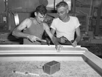 Disabled vet at work. Harry Enochs, left, a trainee, whose right arm was injured by a hand grenade on Saipan, rapidly is regaining full use of the limb while undergoing on-the-job training under the Veterans Administration program. Here, Fred Lose, instructor checks his work at the Bast Planing Mill. Published in Fort Worth Star-Telegram, morning edition, June 30, 1946.