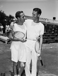 Tennis tournament. Gus Craigo, left, of Paris, Texas and Harold Folks of San Antonio, Texas were playing in he quarterfinals of the Texas Sectional Tennis Tournament at Colonial Country Club. In this picture, both in tennis attire, hold a tennis racket and are embraced with their arms around each other. They are looking at each other and smiling. Published in Fort Worth Star-Telegram, evening edition, June 28, 1946.