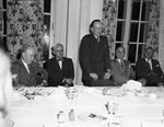Bothwell dinner. Left to right, Mayor Carnrike, Homer Covey, Bothwell and Amon Carter. The men are seated at a table and are dressed in suit, tie, inner collared shirt and eyeglasses except Amon Carter who is not wearing any glasses. Mr. Bothwell is standing in front of a chair and has his hands on the top rail of the chair and seems to be giving a speech while the other men are listening. n the table there are saucers, cups, milk jugs and other condiments. There is also an unidentified man that is seated at the table beside Mr. Carter. In the background there are windows with curtains.