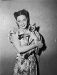 Traveling Companion -- Ju-Ju, pet Siamese cat, made the trip by car from New York to Texas with Kathryn Lee (Kitty Scales), ballerina now on a visit with relatives. Kathryn and her pet are pictured here. She is wearing a linen dress, smiling and holding the cat in her arms. Ju-Ju is wearing a leash. Published in The Fort Worth Star-Telegram evening edition, July 3, 1946.