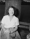 Two Texas Wesleyan College (TWC) co-eds agreed it was a 15 or 16-year-old blond youth who early Friday morning, broke into the second story bedroom of one of them in Ann Waggoner Hall and struck Miss Frances Ross in the face several times before fleeing. Ross suffered a lacerated lip and a small bruise over one eye. She screamed and another resident, saw the fleeing youth in a hallway. Miss Ross was treated in the school infirmary. In an effort to prevent a recurrence of the prowling incident, the college had installed additional floodlighting on the campus. Miss Ross is a junior music student. In this picture, she is sitting on a bench, facing slightly right and smiling. Published in Fort Worth Star-Telegram, morning edition, June 30, 1946.