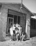 Around Camp director Marion Hardy are gathered, left to right, Mary Beth Hodges; Ann Collier, Gwendolyn Clark, Pat Barnes and Barbara Jane Wehring. They stand at the front door of a brick building. An unknown woman looks through a screen door, from inside. Published in Fort Worth Star-Telegram.