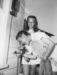 Junior Champs -- Top-seeded Mary Cunningham, El Paso, quenches her thirst after she teamed with Elizabeth Eby of Houston to win junior girls' doubles Sunday at Colonial Country Club in Texas Sectional Tennis Tournament. Mary and Elizabeth are pictured here. Photograph showing Mary drinking from fountain and Elizabeth standing close to fountain while watching Mary. Both girls are laughing. They are wearing tennis uniforms and carrying tennis rackets. Miss Cunningham defeated her partner for singles' crown. There is a container with Thermotabs salt tablets above the water fountain. Published in The Fort Worth Star-Telegram morning edition, July 1, 1946.