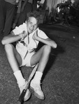Double Winner -- Jack Turpin, 15-year-old Highland Park netter who ranks third nationally, beat Julian Oates of Waco for the boys' singles crown. He then teamed with Oates to take the doubles. Jack is pictured here. He is seated on the ground, wearing tennis uniform and holding a towel with his hands around the back of his neck. A tennis racket is at his feet. He is smiling and posing for the photo. Published in The Fort Worth Star-Telegram evening edition, July 1, 1946.
