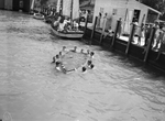 Red Cross water safety demonstration. Sea Scouts clinging to water filled boat at safety demonstration.