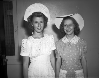 Miss Adeline Daniels, left, daughter of Mr. and Mrs. Gus Daniels, of Fort Worth, Texas, is entertaining her guest Miss Patsy High, right, of Cincinnati, Ohio. Miss High formerly lived in Fort Worth. The women are standing in front of a blank wall, both wearing dresses and hats.
